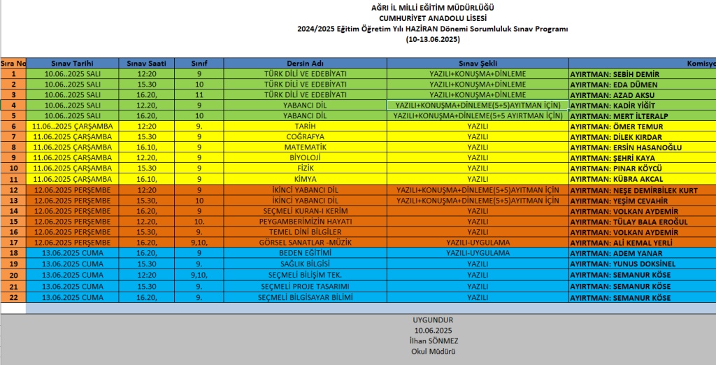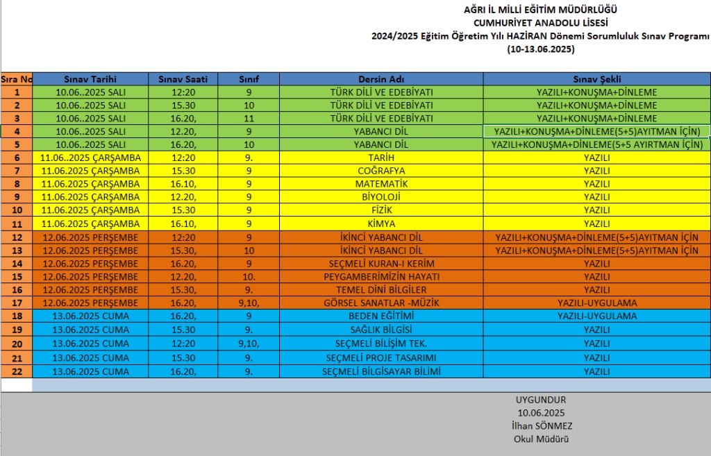 Okulumuz Haziran dönemi sorumluluk sınavları 10-13 Haziran 2025 tarihleri arasında yapılacaktır. Ekli listede öğrencilerin sorumlu olduğu sınavlar yer almaktadır.